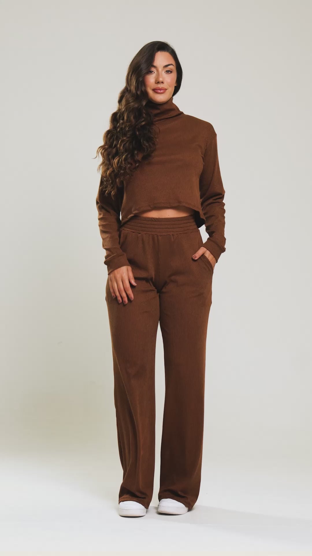 Conjunto Canelado Calça Pantalona + Blusa Golão Manga Longa Bege